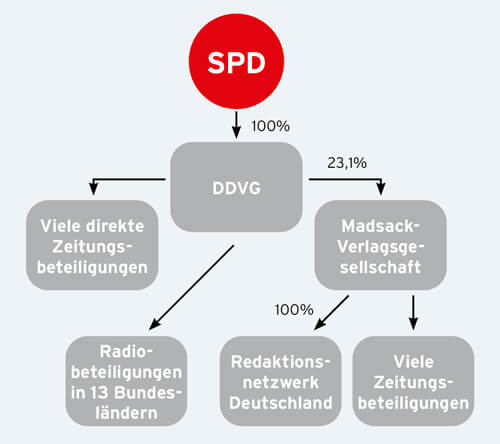 Das Medienimperium der SPD wird gesteuert über die „Deutsche Druck- und Verlagsgesellschaft (DDVG)“. Die SPD ist 100 % Eigentümerin.