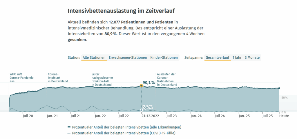 Intensivbettenauslastung in D von 2020 bis 5. Nov 2025 (Quelle: Bundesgesundheitsministerium, https://infektionsradar.gesund.bund.de/de/gesamt/intensivstationen). Die wirtschaftlich angestrebte Auslastung ist 90 % nach Prof. Dr. Stefan Homburg. Die gestrichelte deutlich tiefer verlaufende Linie bezeichnet Corona-positiv getestete (nicht notwendigerweise erkrankte) Patienten.