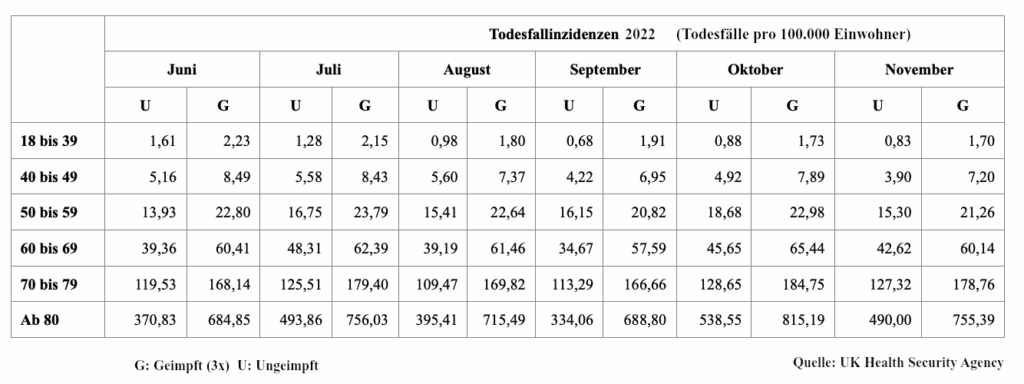 Der Mathematiker Prof. Dr. Thomas Rießinger wertete die 2022-Statistik der Todesfälle (alle Todesursachen) mit und ohne Covid-Impfung der UK Health Security Agency (Großbritannien) aus. Von Juni bis November 2022 starben in allen Altersgruppen dreifach Geimpfte häufiger als Ungeimpfte. Vergleichbare Daten gibt es für Deutschland nicht (Warum nicht?)
