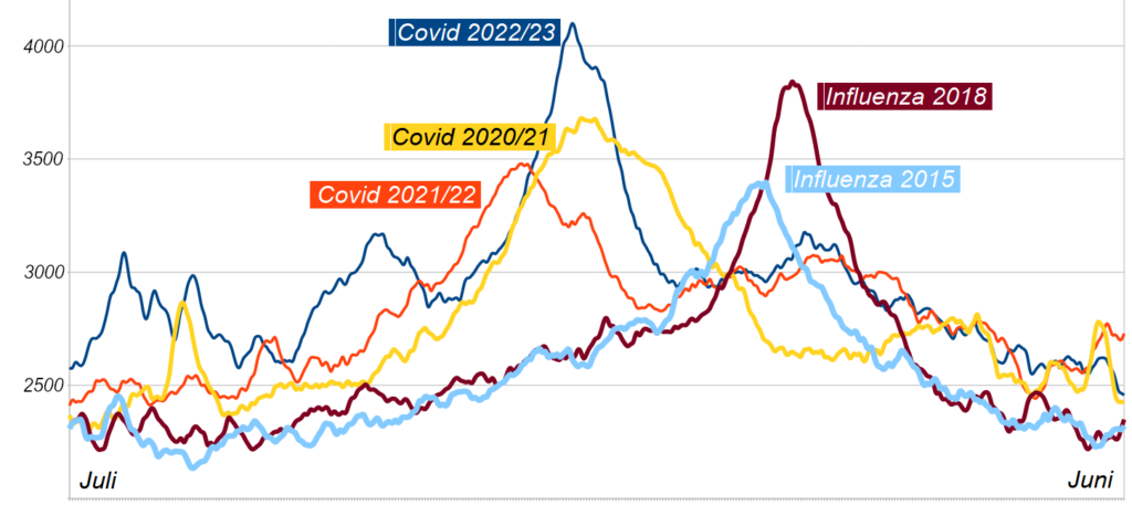 eigene Grafik aus den Daten des Statistischen Bundesamts (DESTATIS) mit einem gleitenden 7-Tage-Mittelwert geglättet. Tabelle 12613-01: „Sterbefälle nach Tagen in Deutschland – Insgesamt.“